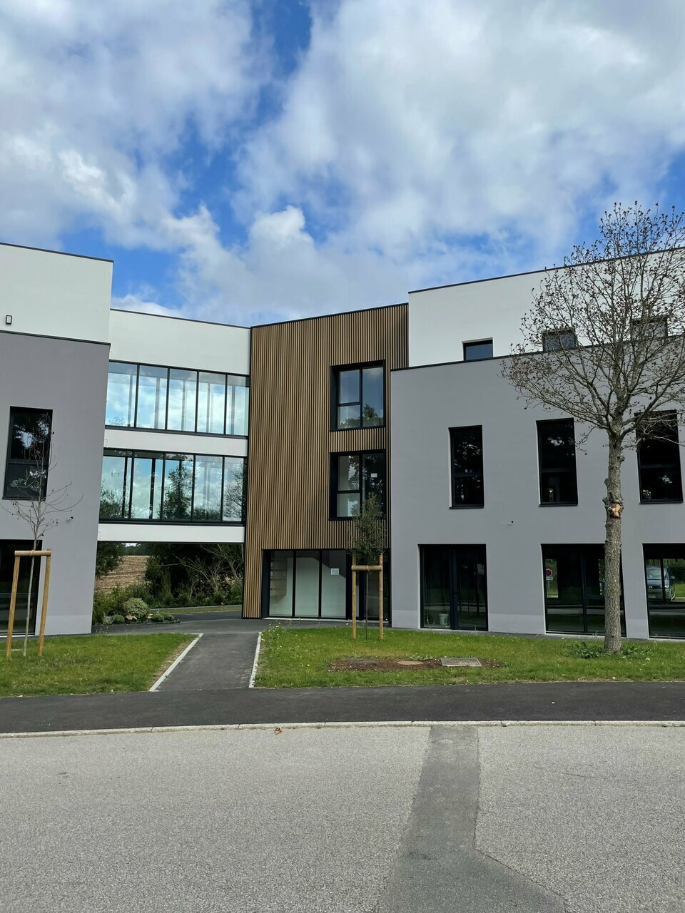 Dans un ensemble immobilier à usage tertiaire, plateau de bureaux brut de béton avec terrasse